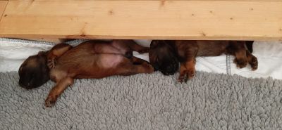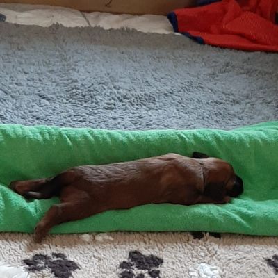 28. Juli 2025 Es geht hinaus in die "Welt" - die Wurfkiste ist ab jetzt nur noch Rückzugsort. Schnell haben die beiden ihr neue Freiheit entdeckt und sofort alles erkundet, aber das macht auch müde. Auch die Milchbar ist jetzt da wo Fiaalah gerade dazu Lust hat. 23.Juli 2025 Schon sind 2 Wochen vorbei und der Platz unter dem Welpenschutzbrett wird so langsam zu eng, aber es ist halt der Lieblingsplatz - von allen bishergen Würfen. Es wird Zeit die Milchbar in der Garten zu verlegen und ...... Hauptsache die Milchbar ist da.