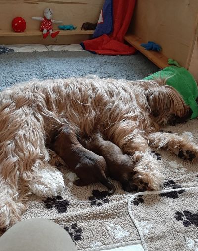29. Oktober 2020 Unser Kleeblatt wächst und gedeiht. Mit vier Welpen ist Eshaani immer Herr der Lage und umsorgt die Kleinen hingebungsvoll.
